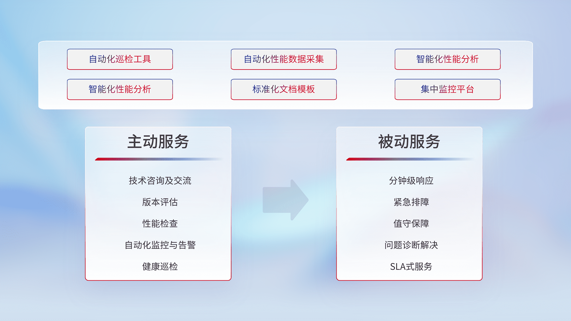 智能化工具和标准化文档,,,,保障服务质量,,,,提供主动服务(包含技术咨询、、版本评估、、、性能检查、、、、自动化监控与告警、、健康巡检)和被动服务包含(分钟级响应、、紧急排障、、值守保障、、、问题诊断解决、、、、SLA服务)。。。
