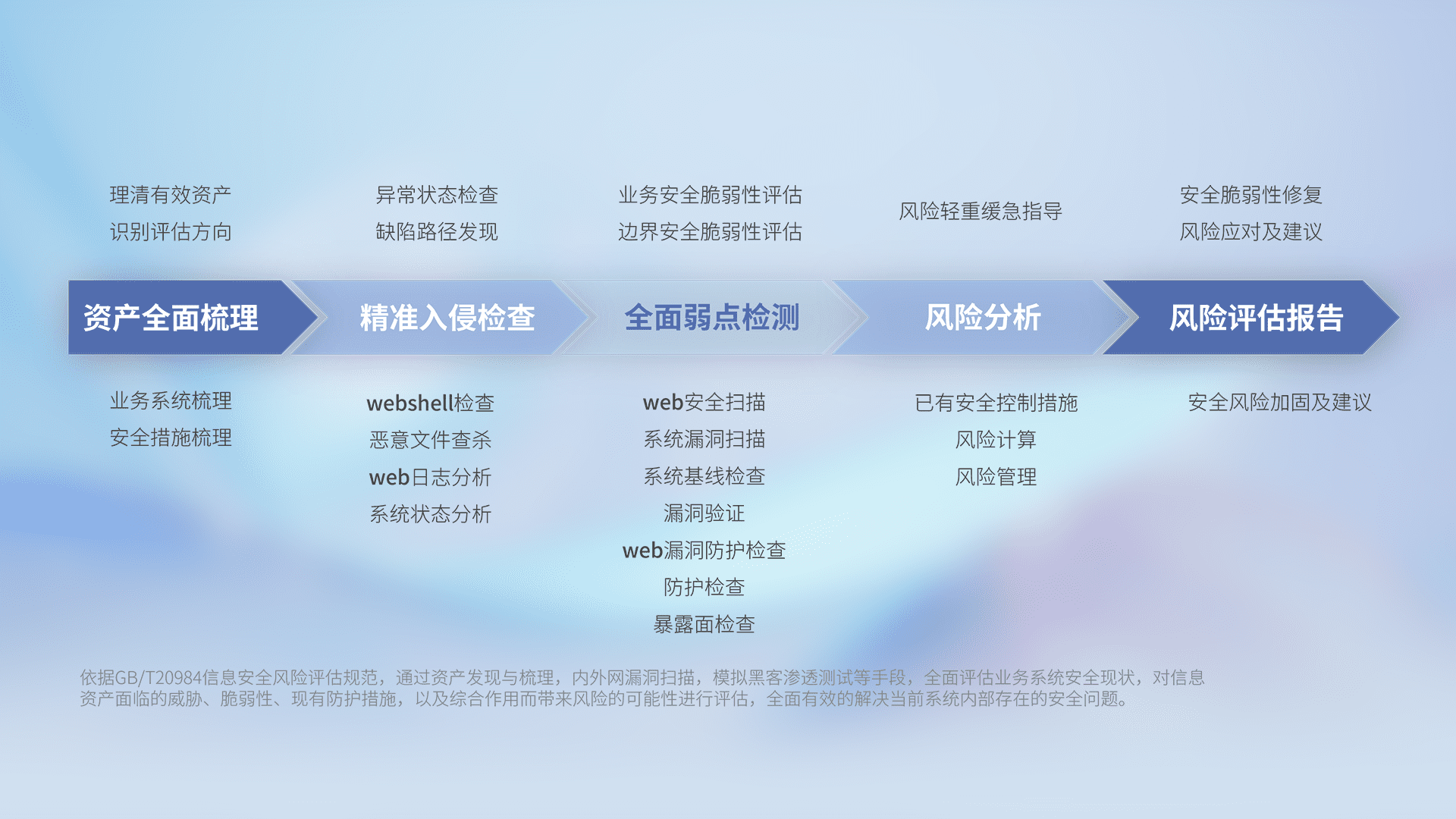 针对客户行业特性,,以专业的安全服务+多厂商联合解决方案提供专属的一站式安全管理服务,,,,帮助客户全面感知网络空间威胁,,基于识别、、、、检测、、、分析、、、防护、、、监测、、、响应的服务理论模型,,从方案咨询、、集成交付、、评估验证、、优化加固、、、、运维运营,,,致力于为客户提供完整的闭环管理式安全服务。。。以实战经验为客户打造高抵御风险的安全体系,,,,帮助客户发现威胁、、、对抗威胁、、、处置威胁,,,不断积累安全对抗能力,,,,持续保障数字化安全。。。